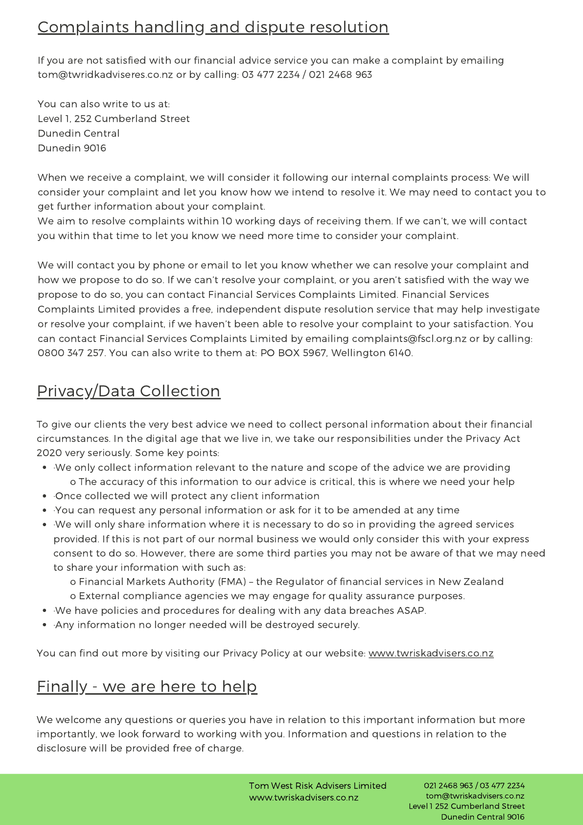 Phone: 021 246 8963 / 03 477 2234Email: tom@twriskadvisers.co.nz